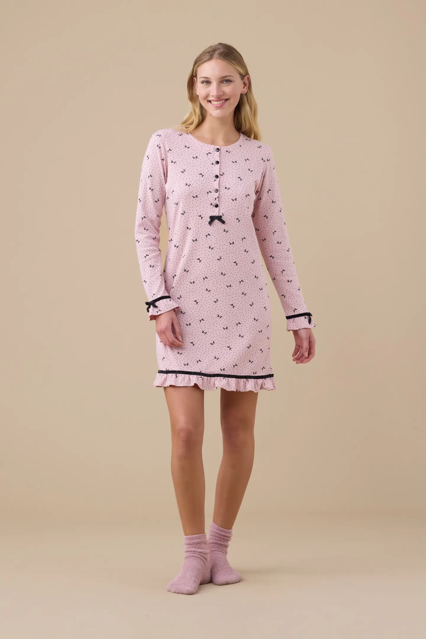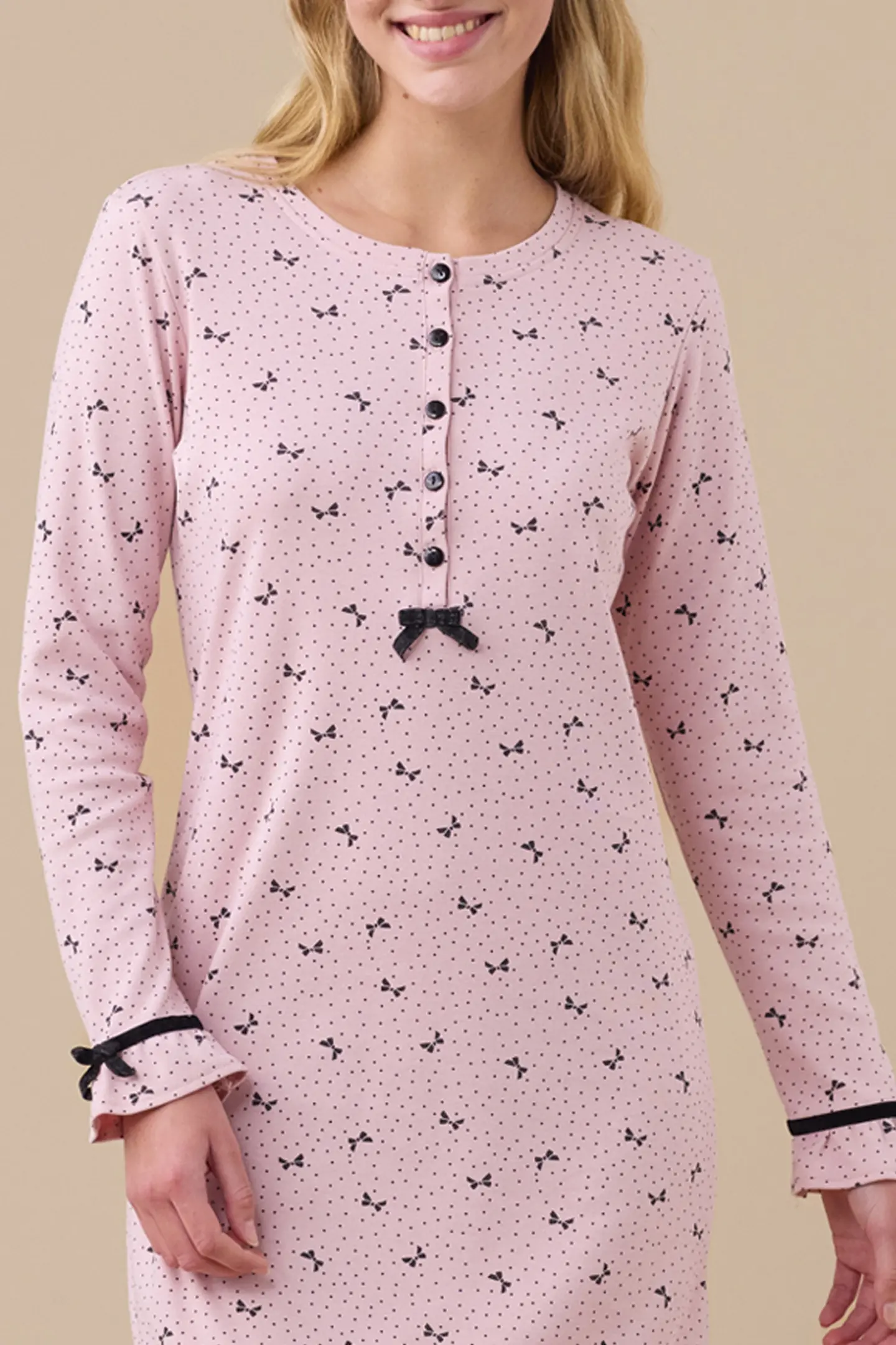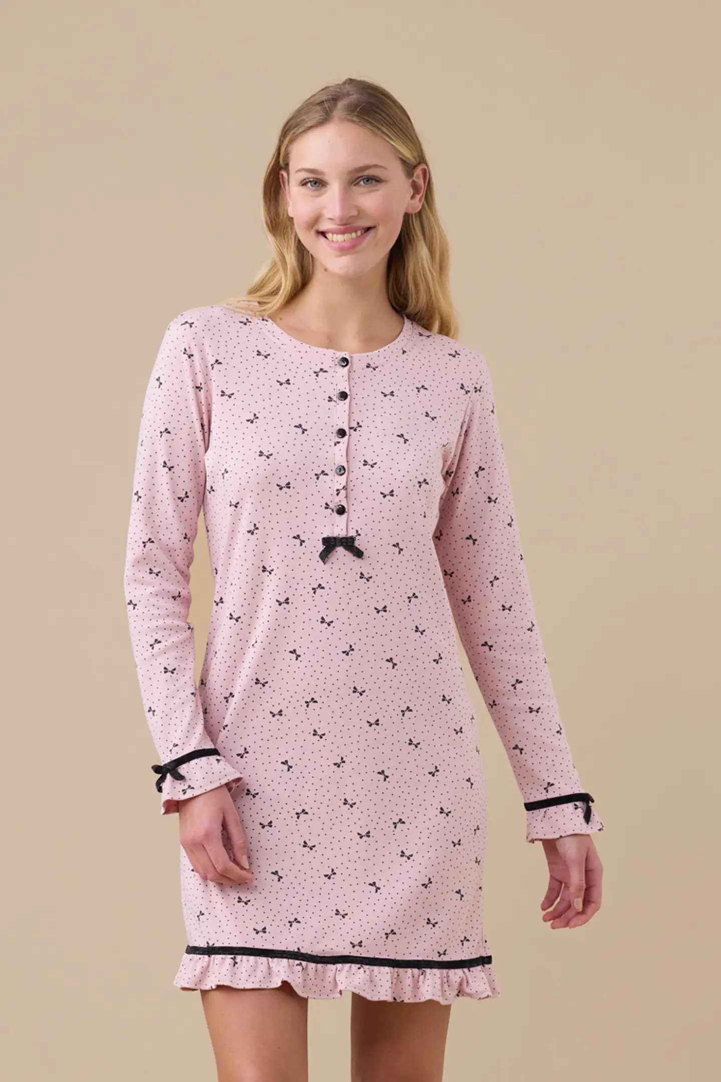 Νυχτικό romantic Noidinotte. Ροζ με τύπωμα μαύρα φιογκάκια και πουά. Μαύρη φινίρισμα στα τελειώματα.