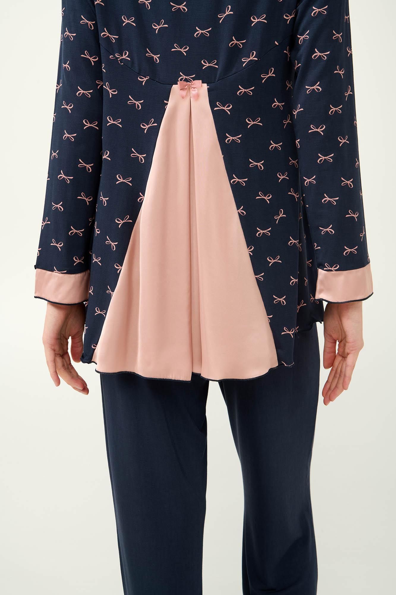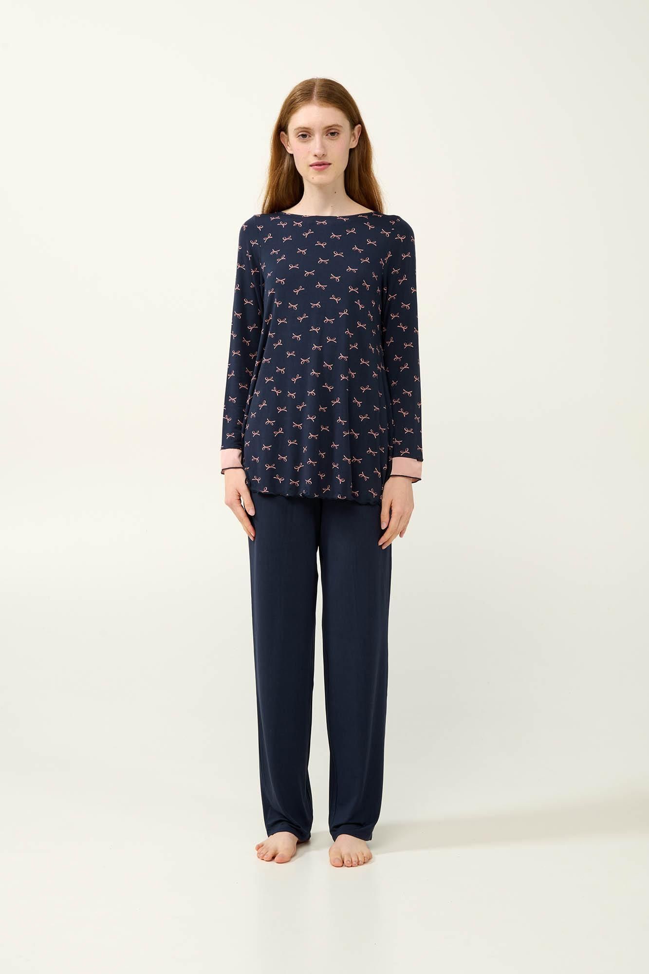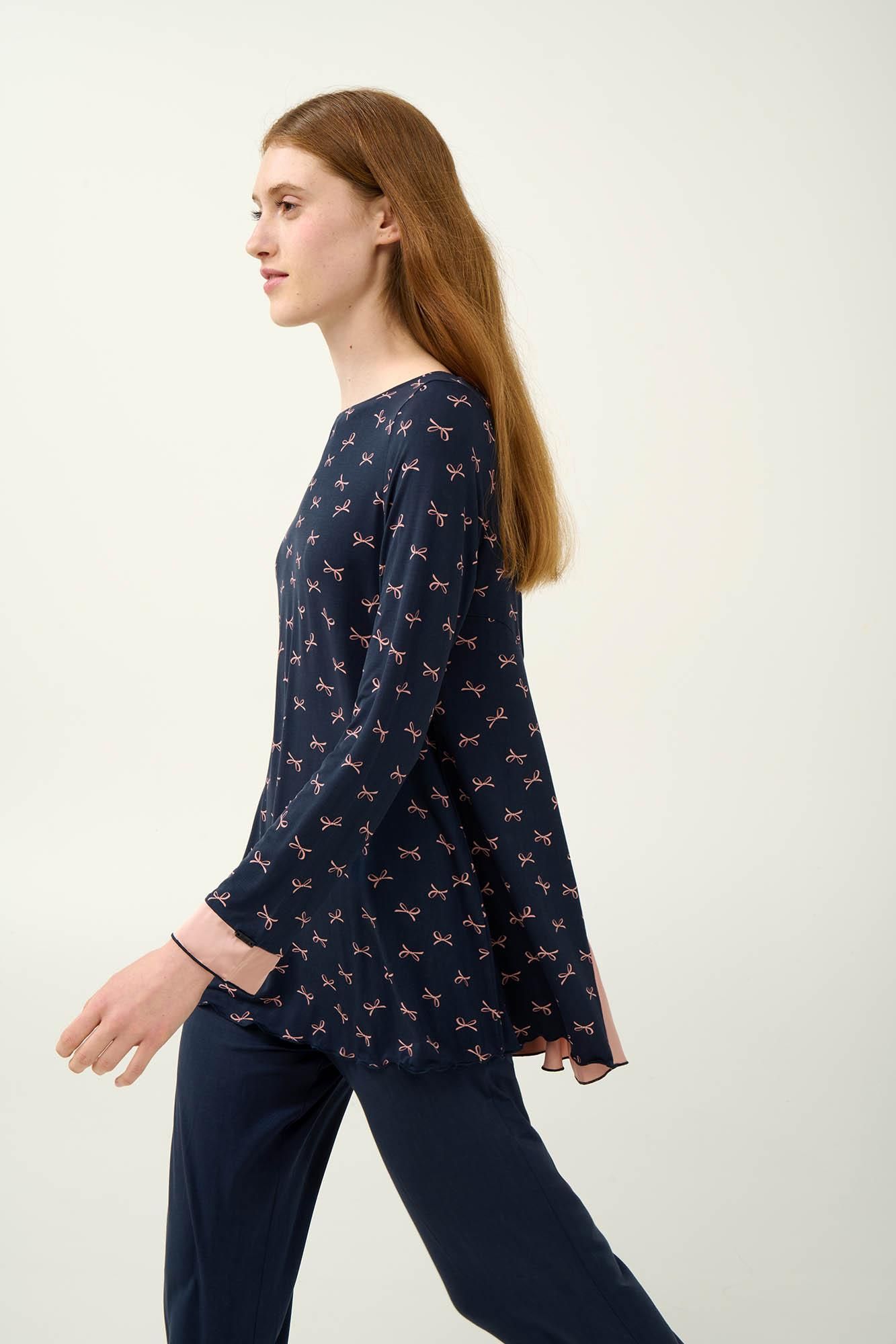 Πυζάμα μπλε με σωμών φιογκάκι Vamp. Προσθέστε στη γκαρνταρόμπα σας ένα σετ χειμερινές γυναικείες πυτζάμες, φτιαγμένες από εξαιρετικής ποιότητας LENZING Tencel Modal Micro, που προσφέρει μοναδική απαλότητα και διαπνοή στο δέρμα. Η μπλούζα είναι διακοσμημένη με ροζ φιογκάκια πάνω σε ζεστή μπλε βάση, ενώ οι λεπτομέρειες από σιφόν στα μανίκια και την πλάτη προσθέτουν μια ρομαντική νότα. Το μονόχρωμο παντελόνι εξισορροπεί αρμονικά το σύνολο, προσφέροντάς σας στυλ και άνεση σε κάθε σας κίνηση. Ένα ιδανικό σετ για ήρεμα απογεύματα ή και χαλαρά πρωινά.