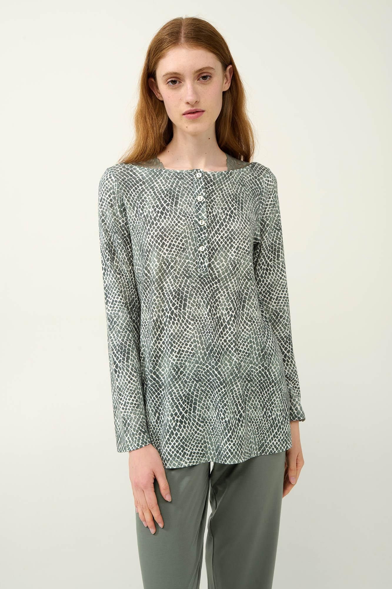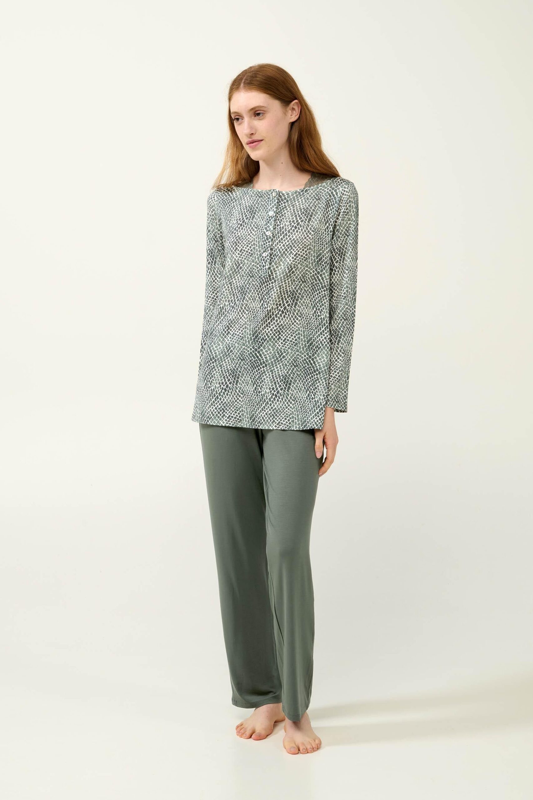 Πυζάμα green animal print Vamp. Προσθέστε στη γκαρνταρόμπα σας ένα σετ χειμερινές γυναικείες πυτζάμες, κατασκευασμένο από LENZING Tencel Modal Micro, με εξαιρετικά απαλή υφή και ευχάριστη εφαρμογή. Ένα σετ ιδανικό για τις στιγμές χαλάρωσης σας.