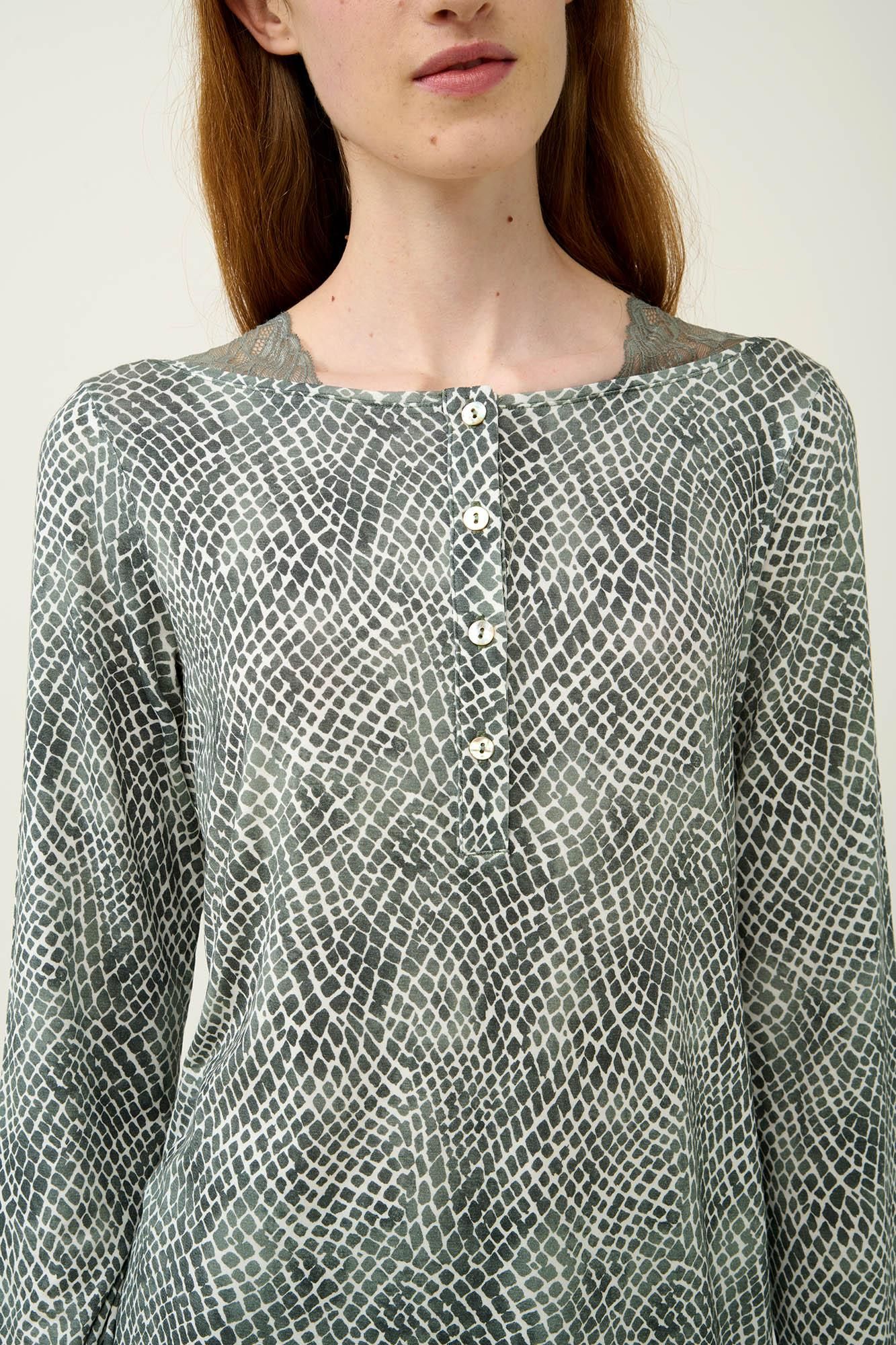 Τop animal print πράσινο και λευκό, διακοσμημένο με δαντέλα στη στρογγυλή λαιμόκοψη. Διαθέτει και κουμπιά