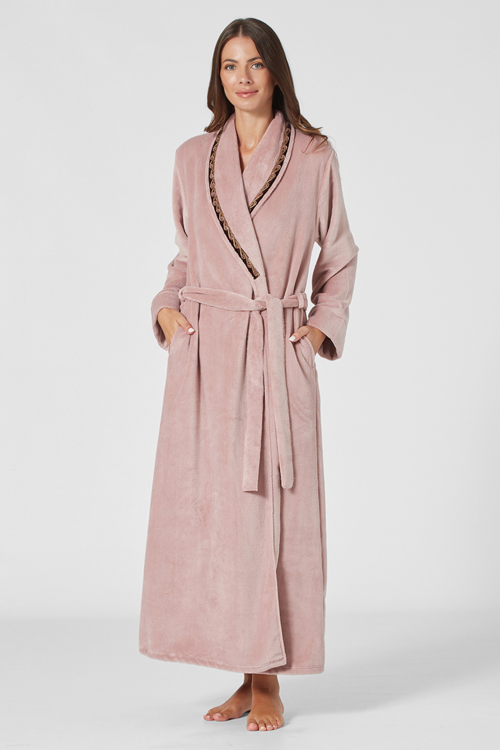 Ρόμπα maxi dusty pink fleece Penky. Μάξι ρόμπα σε υπέροχη απόχρωση από πολύ απαλό προβατάκι με τρέσα στο γιακά. Εξαιρετική αίσθηση στο άγγιγμα, κομψή, ζεστή και πάντα φινετσάτη. Άνετη γραμμή, χιαστί με ζώνη και τσέπες.