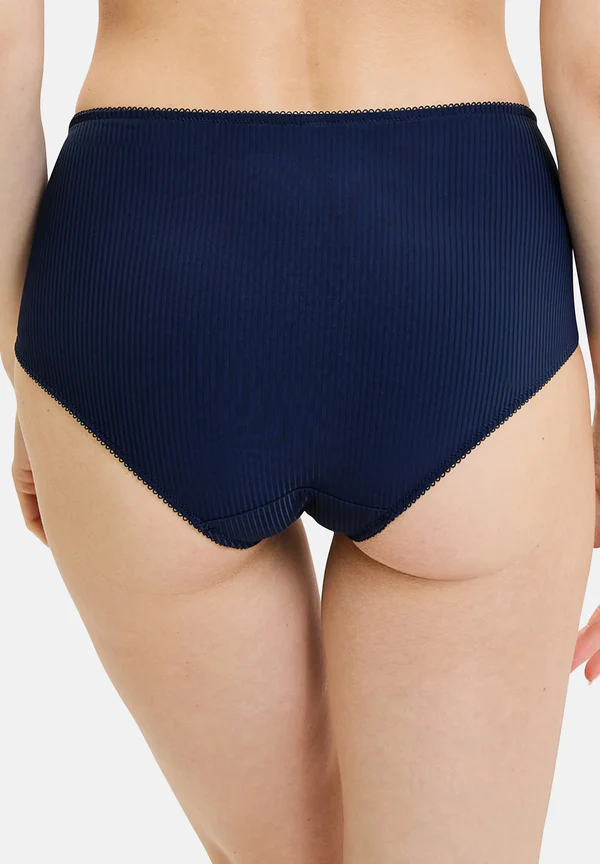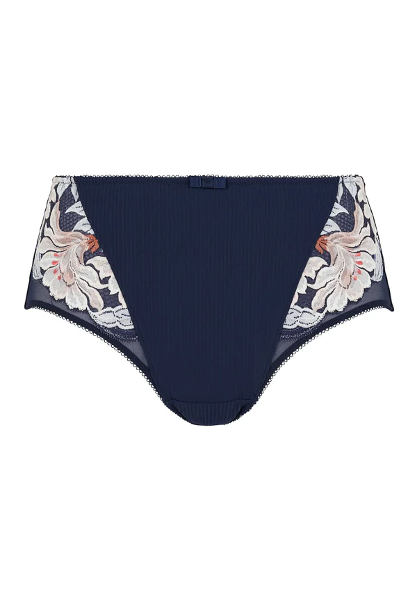 Η σειρά Rosa Fantaisie μας είναι ντυμένη σε μια έντονη μπλε βάση για μια πάντα ρομαντική εμφάνιση, σε αρμονία με τις ποιητικές αποχρώσεις και την πολύχρωμη φλοράλ δαντέλα. Μεσαίο σλιπ. Εξαιρετικά άνετο ριγέ μικροΐνες με μοτίβο. Διαφανές τούλι μπροστά για μια πινελιά ανάλαφρης αίσθησης. Εντυπωσιακή τυπωμένη φλοράλ δαντέλα μπροστά. Μικρό επίπεδο φιόγκο μπροστά. Διακοσμητικό λάστιχο picot στη μέση και γύρω από τους μηρούς.