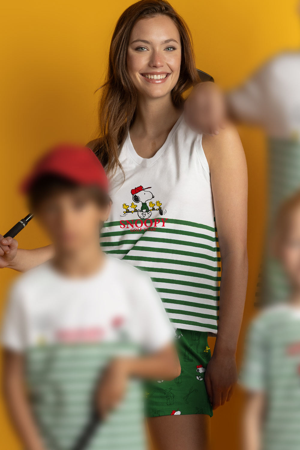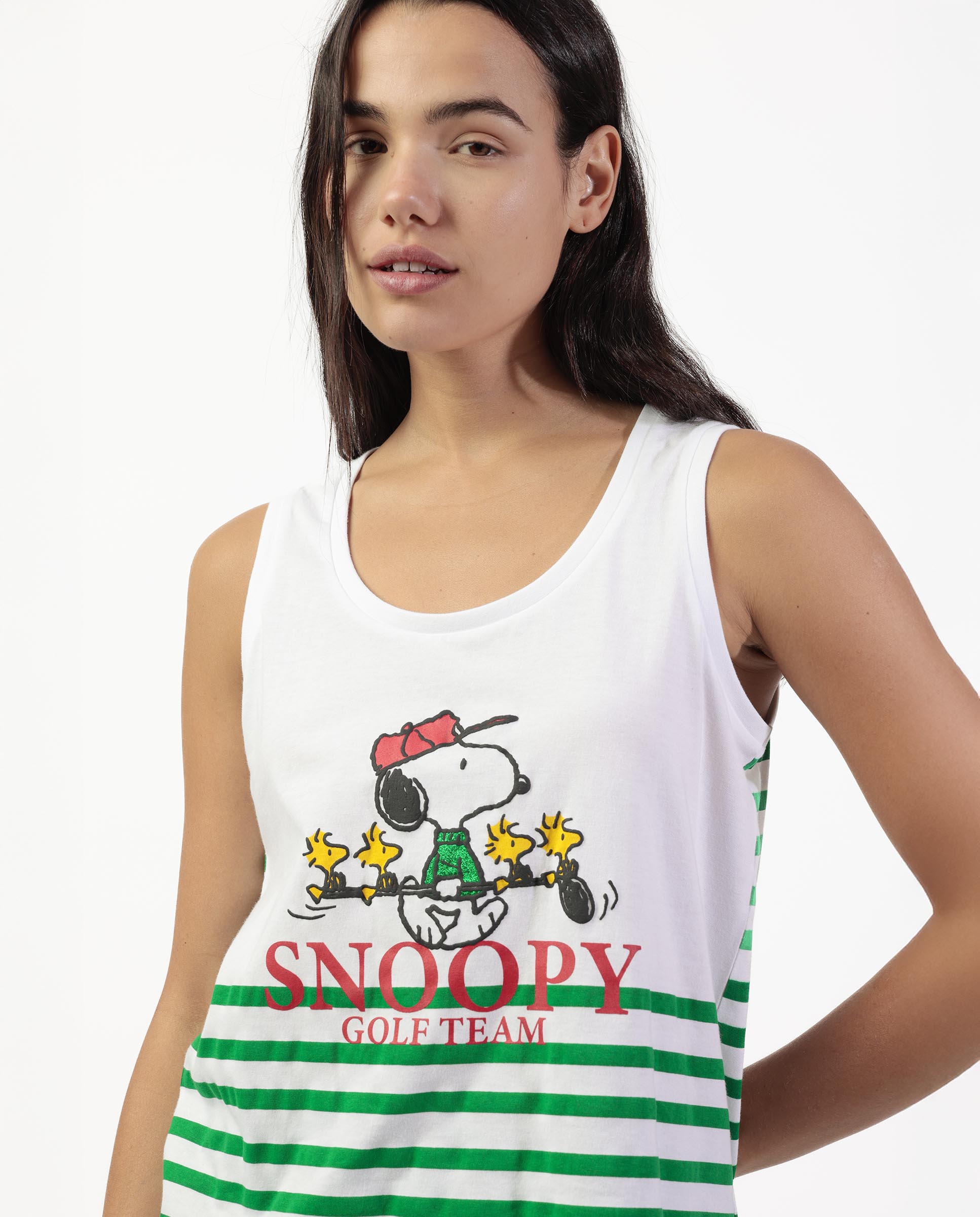 Top λευκό με ρίγες πράσινες, αμάνικο με στρογγυλή λαιμόκοψη. Στάμπα Snoopy golf team Peanuts.