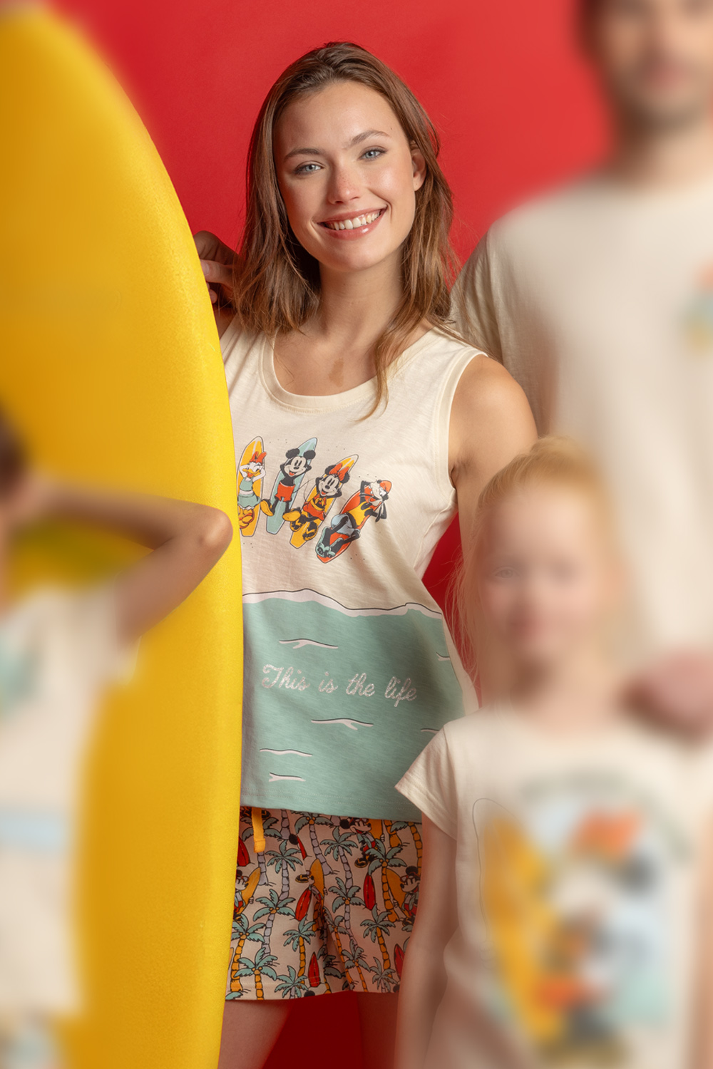Bottom σορτς κρεμ με τύπωμα mickey mouse surf, σε ίσια, κανονική γραμμή με λάστιχο και ρυθμιζόμενο κορδόνι στην μέση.