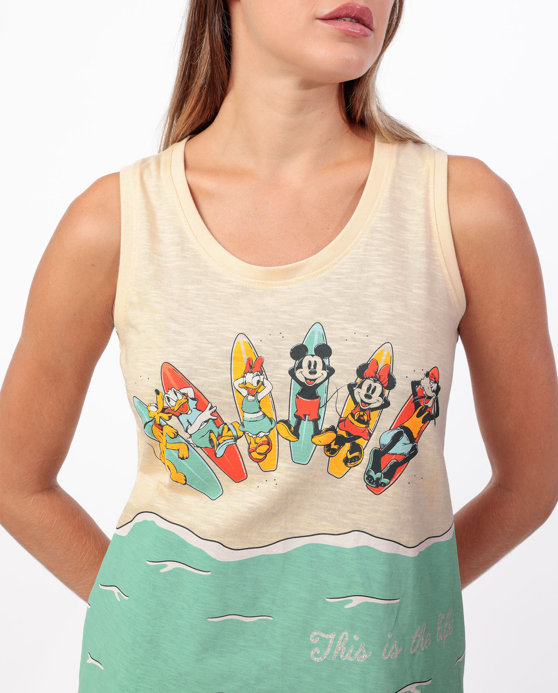 Top κρεμ-βεραμάν αμάνικο, με στρογγυλή λαιμόκοψη και στάμπα mickey and friends