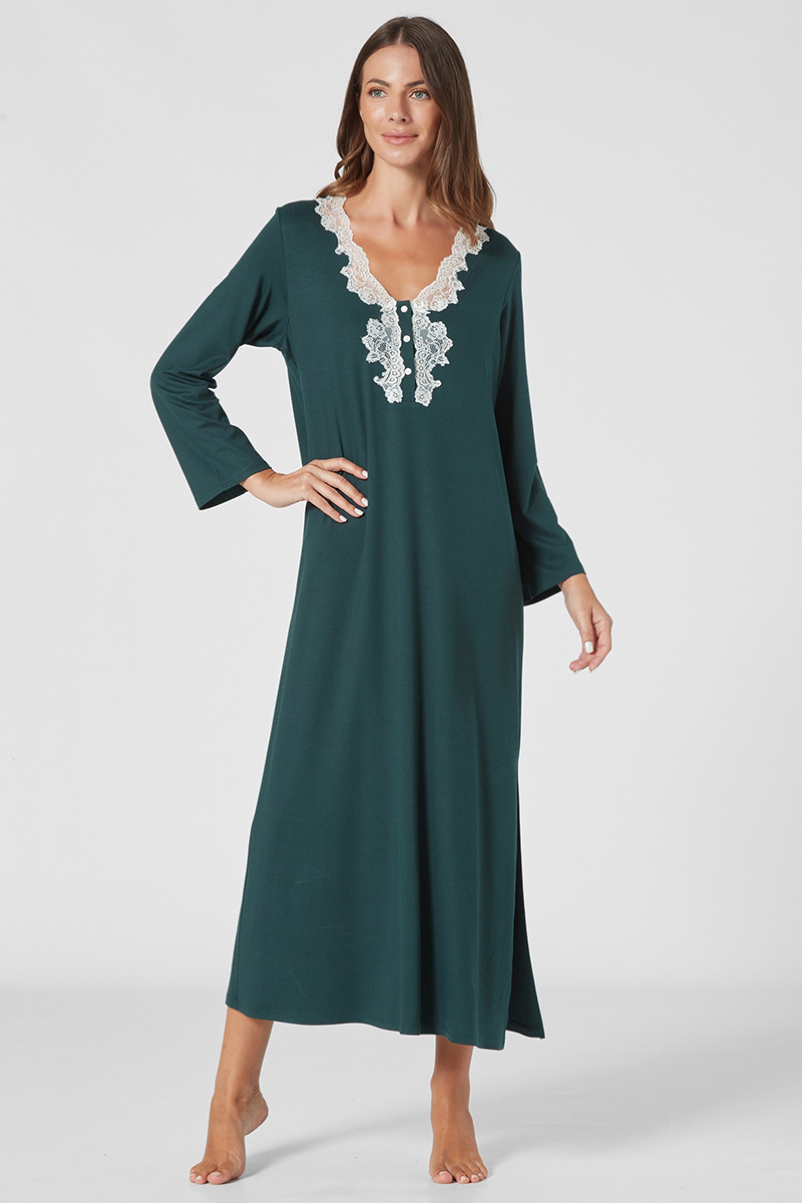 Μάξι νυχτικό σε πράσινη – κυπαρισσί απόχρωση με μακρύ μανίκι, V διακοσμημένο από λευκή δαντέλα και κουμπάκια. Ένα υπέροχο κλασικό και άνετο νυχτικό για όλους τους σωματότυπους.