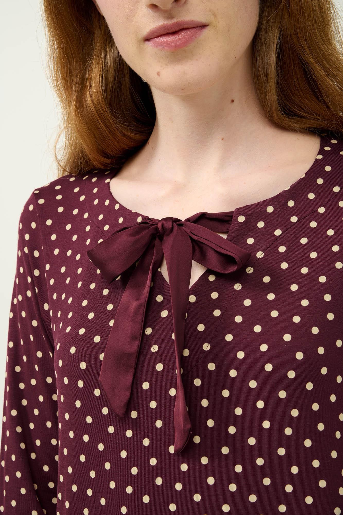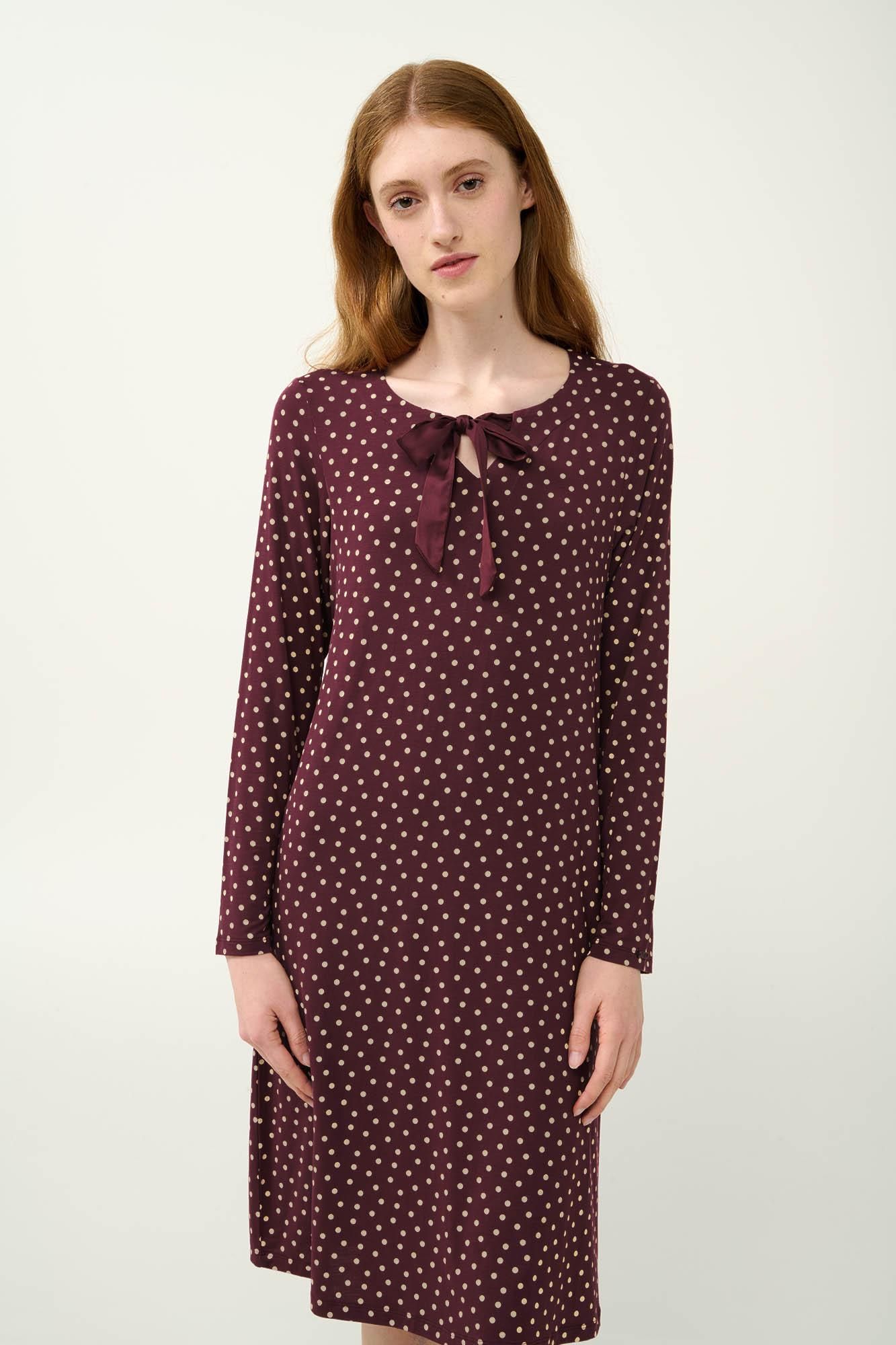 Νυχτικό midi bordeaux dots Vamp. Ζήσε την απόλυτη άνεση και κομψότητα με αυτό το χειμερινό νυχτικό, κατασκευασμένο από πολυτελές LENZING Tencel Modal Micro. Με κλασικό μπεζ πουά πάνω σε πλούσιο μπορντό φόντο, προσφέρει απαλή και λεία αίσθηση που αγκαλιάζει το σώμα με χάρη. Σχεδιασμένο με ιδιαίτερη λαιμόκοψη που δένει μπροστά με σατέν κορδέλα, για να χαρίσει μια γοητευτική και ρομαντική νότα στην εμφάνιση σας. Μια όμορφη επιλογή που συνδυάζει διαχρονικό στυλ με καθημερινή άνεση.