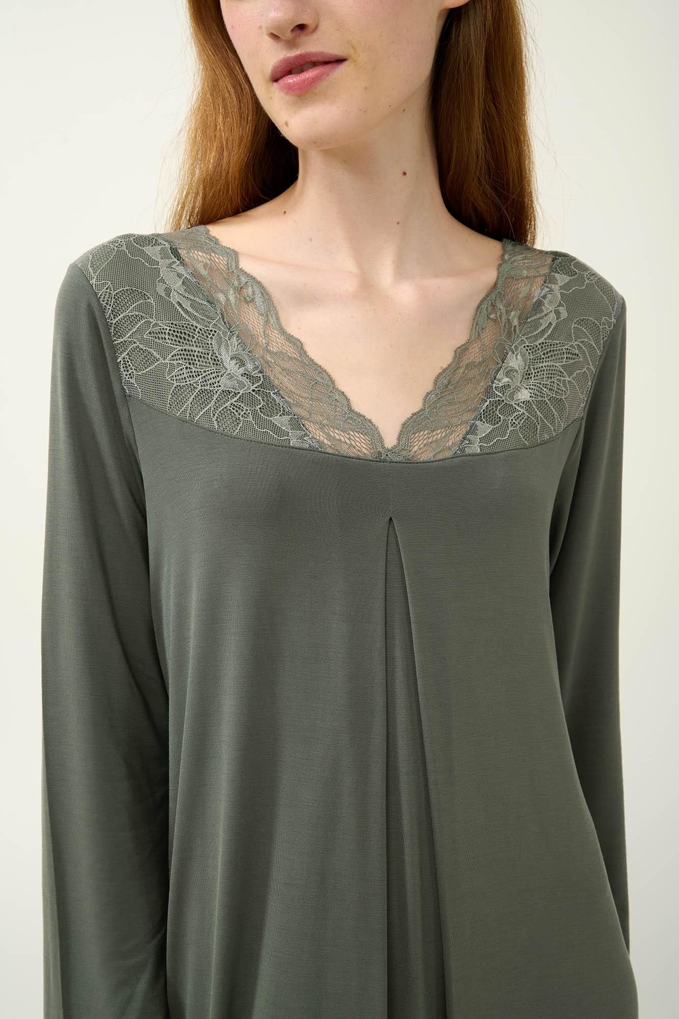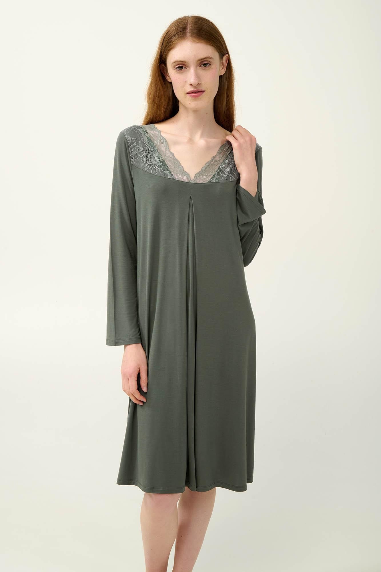 Νυχτικό midi green Vamp. Απολαύστε την άνεση και την κομψότητα που προσφέρει αυτό χειμερινό νυχτικό, κατασκευασμένο από πολυτελές LENZING Tencel Modal Micro που αγκαλιάζει ευχάριστα το σώμα. Σχεδιασμένο με V λαιμόκοψη διακοσμημένη με δαντέλα, που προσθέτει μια νότα θηλυκότητας και ρομαντισμού. Μια απαλή πιέτα στο στήθος ενισχύει τη χαλαρή εφαρμογή, προσφέροντας άνεση καθ’ όλη τη διάρκεια της ημέρας. Ιδανικό για ήρεμες βραδιές και ξεκούραστο ύπνο.