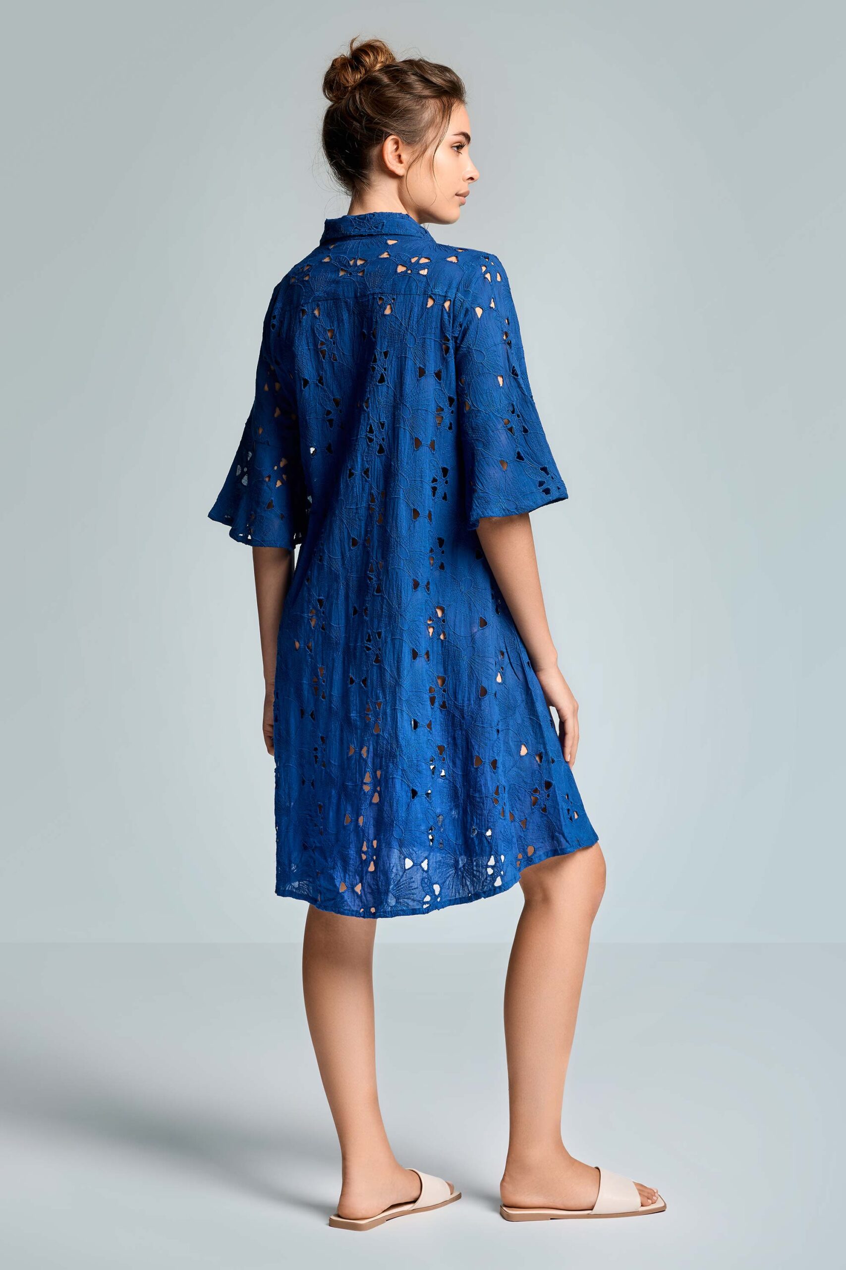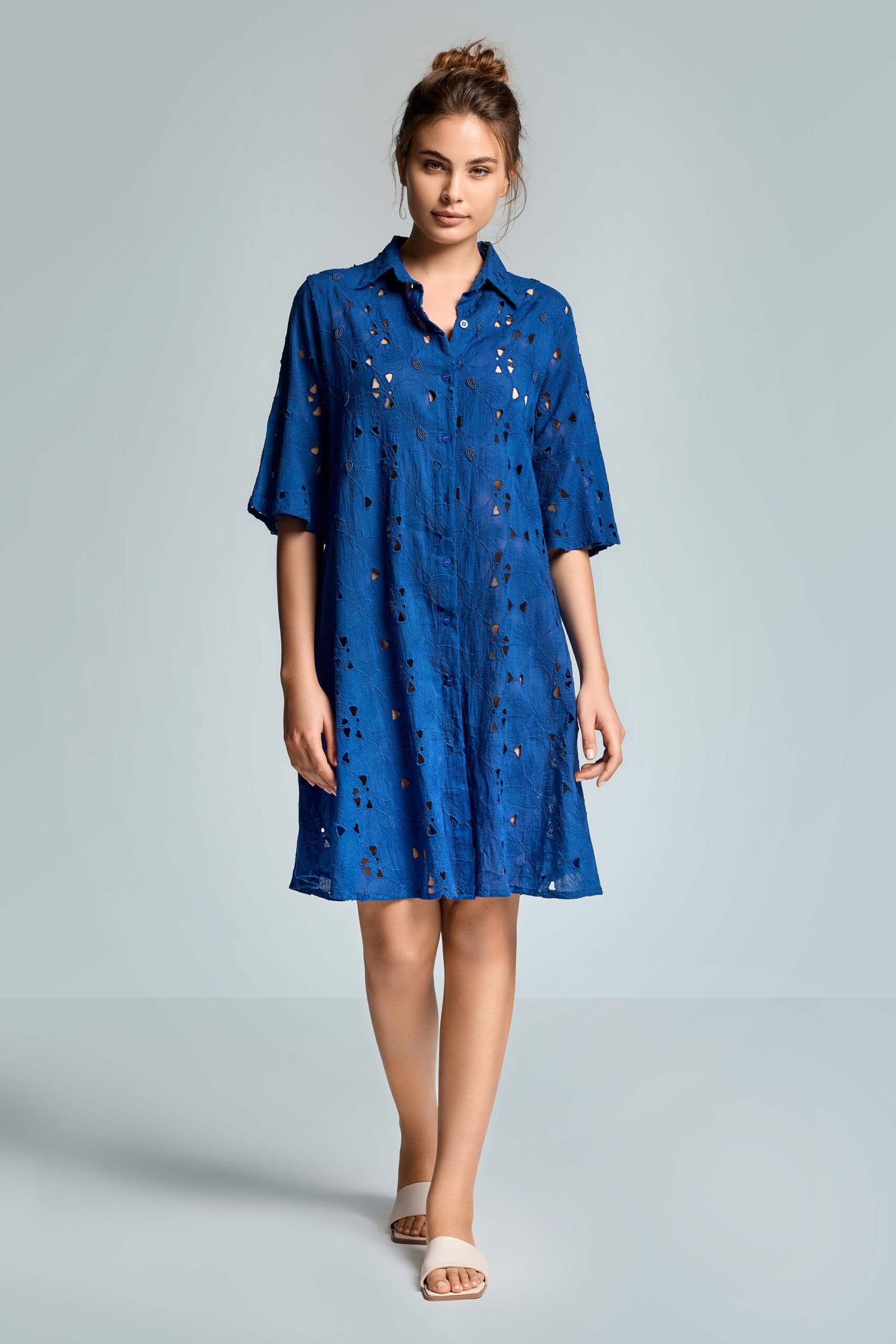Φόρεμα Romina σε μπλε χρώμα. Το φόρεμα Romina είναι ένα ευέλικτο και κομψό κομμάτι, ιδανικό για κάθε περίσταση. Κατασκευασμένο από 100% βαμβάκι, προσφέρει μια φρέσκια και άνετη εφαρμογή. Παραδοσιακός γιακάς με κουμπιά μπροστά. Αεριζόμενο και άνετο ύφασμα. Χαλαρή και άνετη εφαρμογή. Μανίκια 3/4 και βολάν στο κάτω μέρος