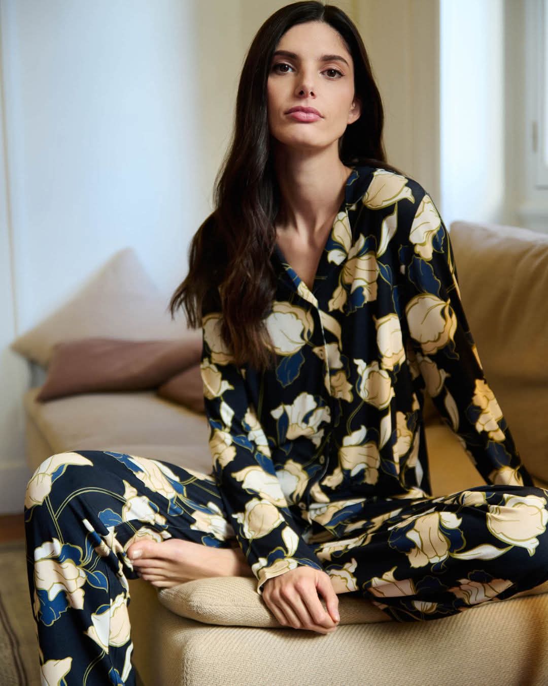 Πυζάμα blue floral Vamp. Ανανεώστε τη συλλογή σας με ένα σετ γυναικείες πυτζάμες σε ρομαντικό φλοράλ μοτίβο με λευκές τουλίπες. Το κλασικό κουμπωτό πάνω μέρος προσδίδει διαχρονική αίσθηση και κομψότητα. Κατασκευασμένο από υψηλής ποιότητας ελαστική viscose, αυτό το σετ προσφέρει απαλή αίσθηση στο δέρμα, επιτρέποντας στο σώμα να αναπνέει. Ένας κλασικός συνδυασμός άνεσης και κομψότητας για κάθε στιγμή στο σπίτι.