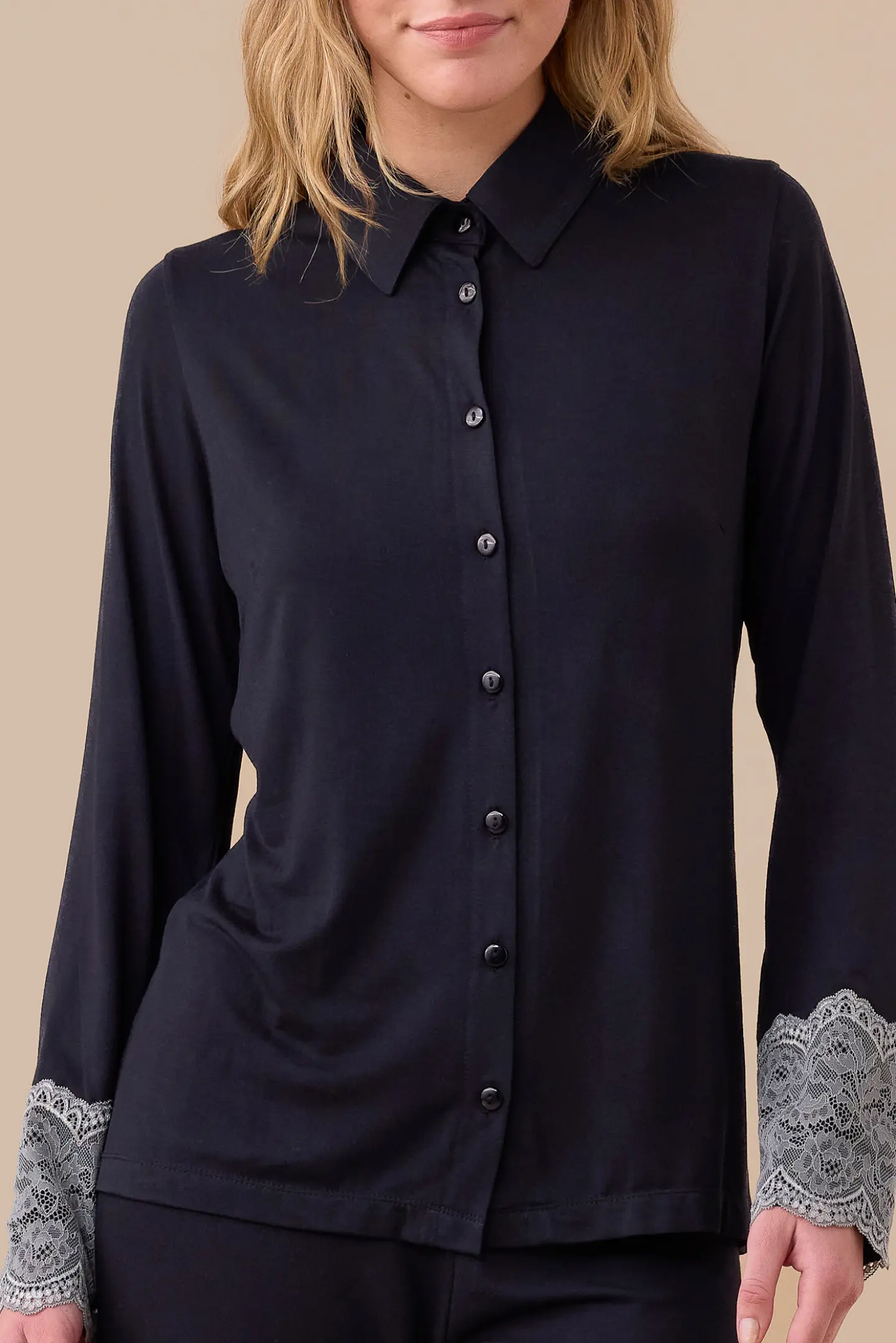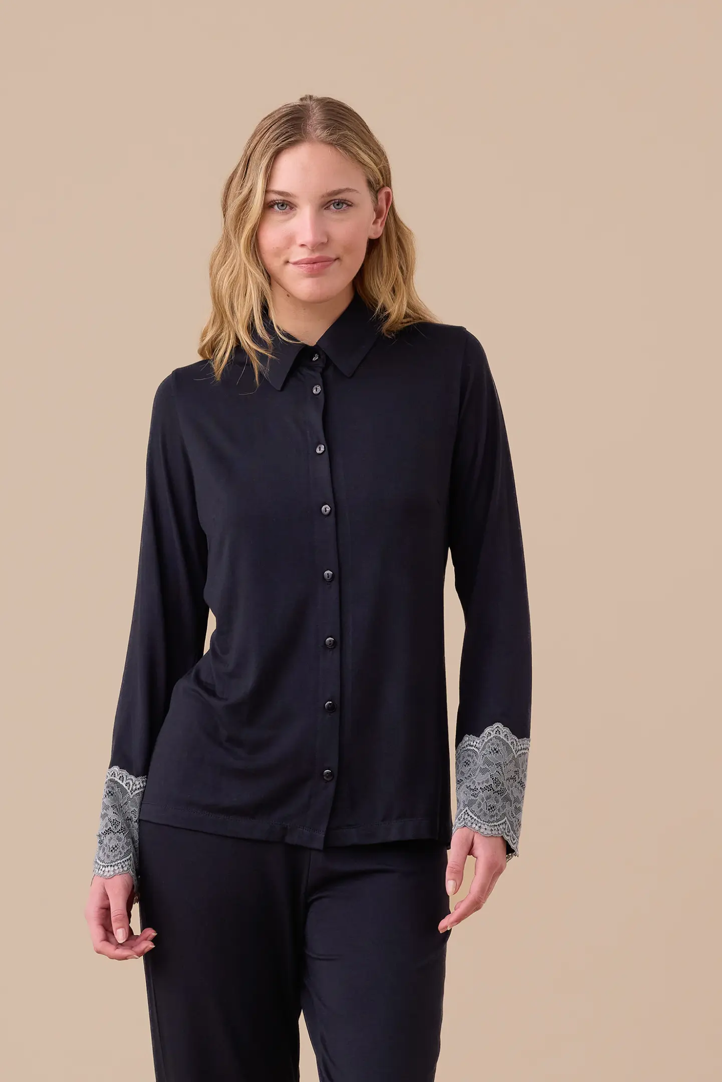 Top με κουμπιά πέτο γιακά. Δαντέλα γκρι στις μανσέτες.