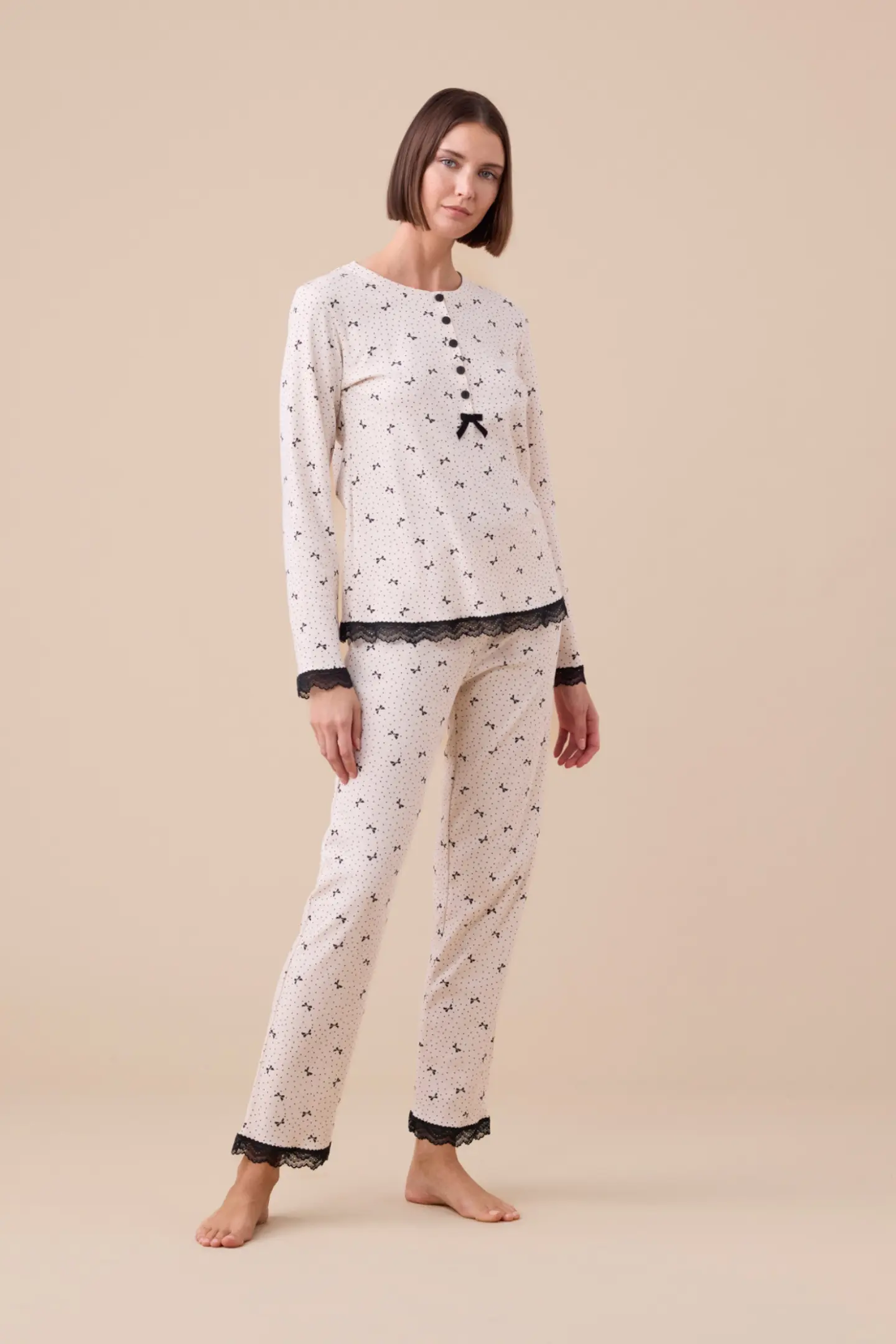 Πυζάμα romantic Noidinotte. Εκρού με τύπωμα μαύρα φιογκάκια και πουά. Μαύρη δαντέλα στα τελειώματα.