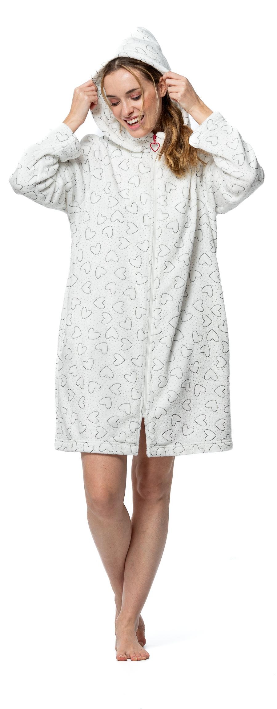 Ρόμπα hearts fleece Senoretta by Egatex. Λευκή με μαύρες καρδιές και μικρά πουά. Με φερμουάρ, τσέπες και γιακά. Με αποσπώμενη κουκούλα
