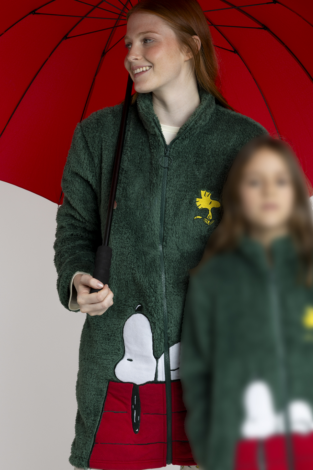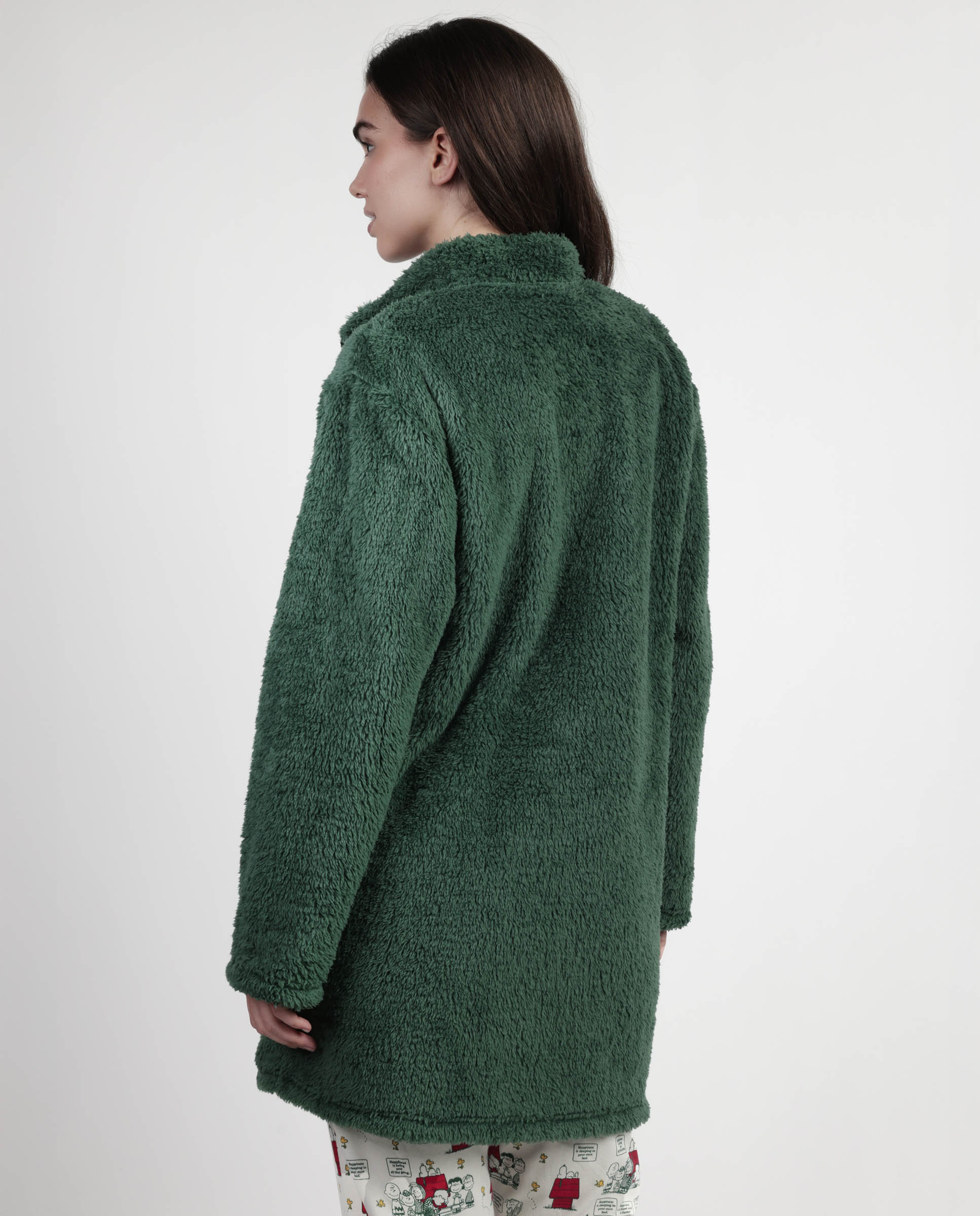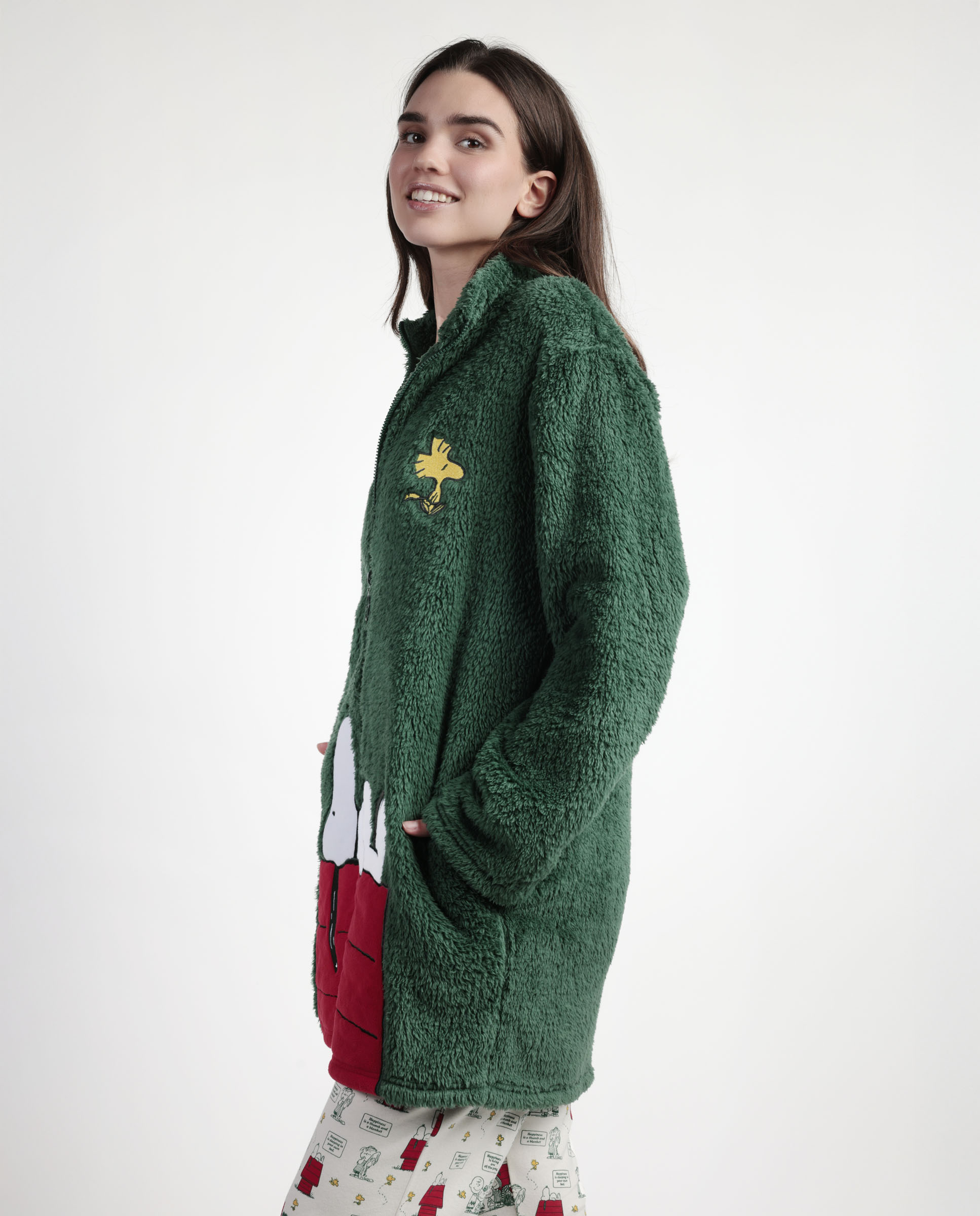 Ρόμπα ζακέτα fleece green Snoopy Peanuts. Με φερμουάρ, διακοσμημένη με στάμπα snoopy and friends, τσέπες και γιακά