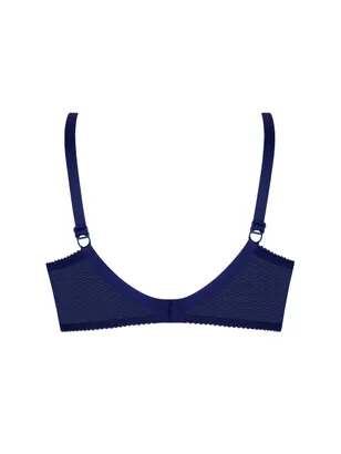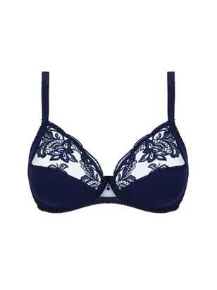 Σουτιέν μπανέλα full cup Eclat Couture Lise Charmel σε μπλε χρώμα. Σουτιέν με μπανέλα, 3 τμήματα, γεμάτες cups και δομημένο πλαϊνό τμήμα. Σμιλεμένη εφαρμογή. Φυσικά, άνετη εφαρμογή. Άνω cups με κεντημένο σχέδιο. Κάτω cups και πλαϊνά τμήματα από σατέν πλεκτό. Πίσω μέρος από επενδεδυμένο τούλι. Διαφανές τούλι και στρας ανάμεσα στις cups. Μοτίβα γκιπούρ κοσμούν τις τιράντες. Ρυθμιζόμενες ελαστικές τιράντες