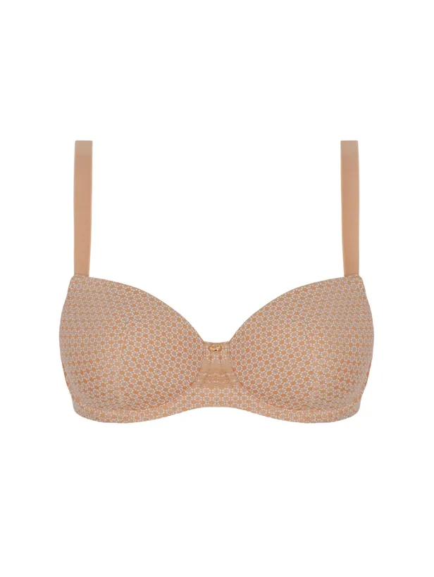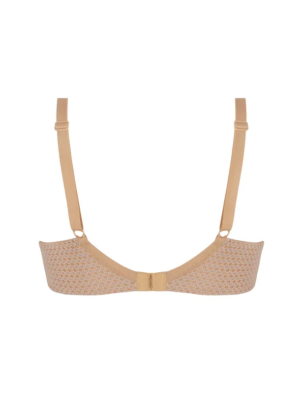 Σουτιέν με επένδυση και μπανέλα Daily Paillette Antigel by Lise Charmel σε μπεζ απόχρωση. Λείο ύφασμα σε μπεζ φόντο με λουλούδια και ένθετο νήματος Lurex. Επίχρυσο κόσμημα με την υπογραφή “Antigel” ανάμεσα στις cups. Με ρυθμιζόμενες ελαστικές τιράντες. Πλάτη σε σχήμα U-back.