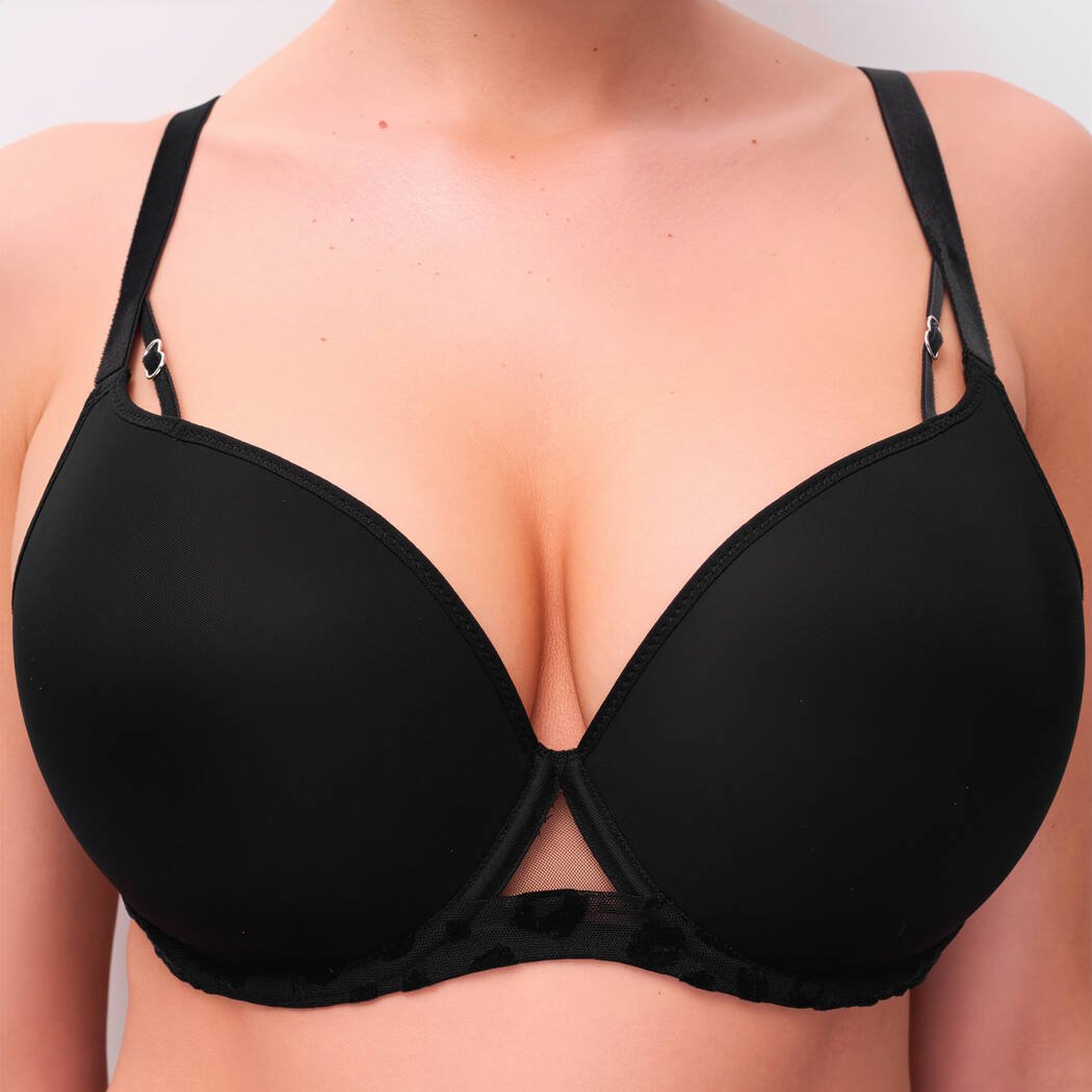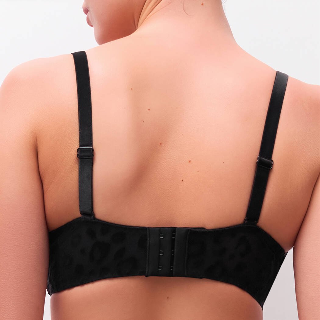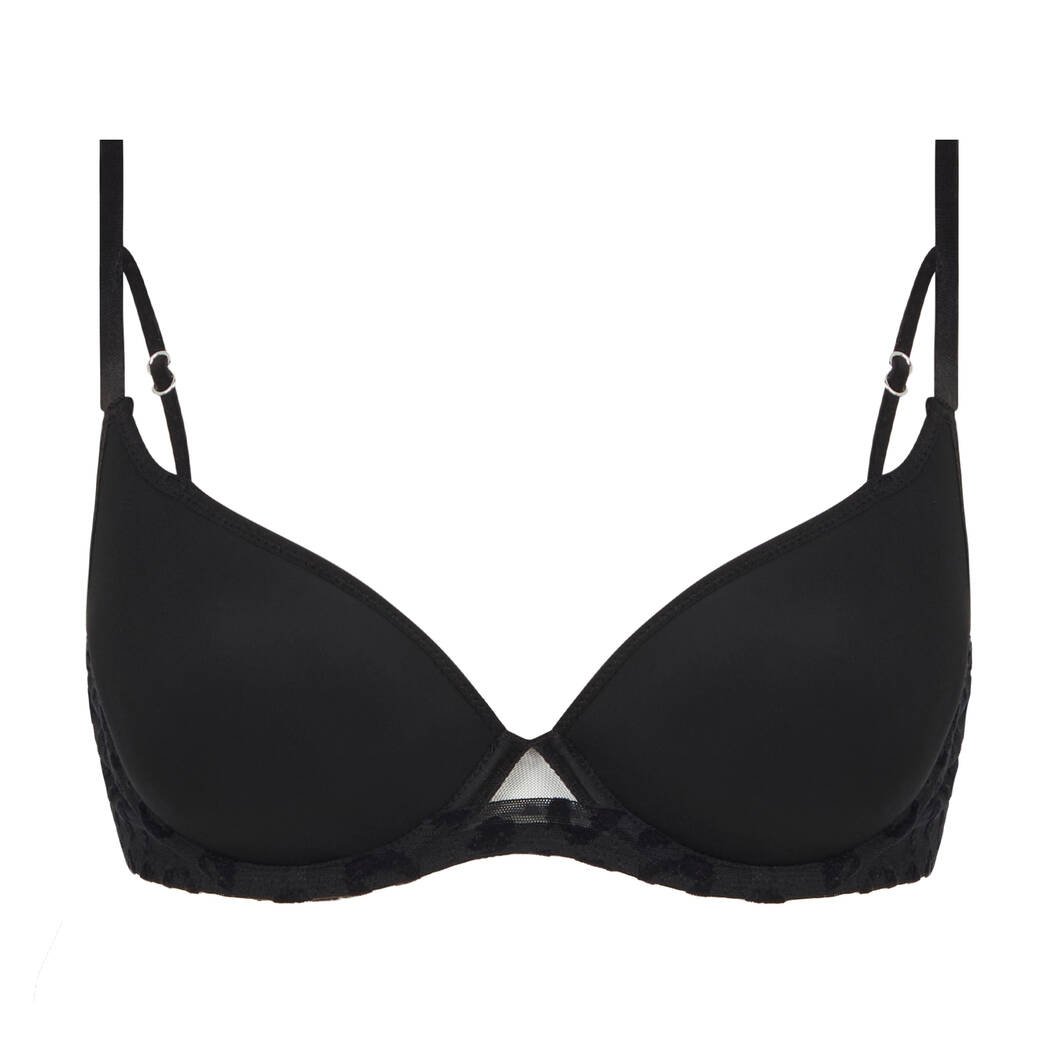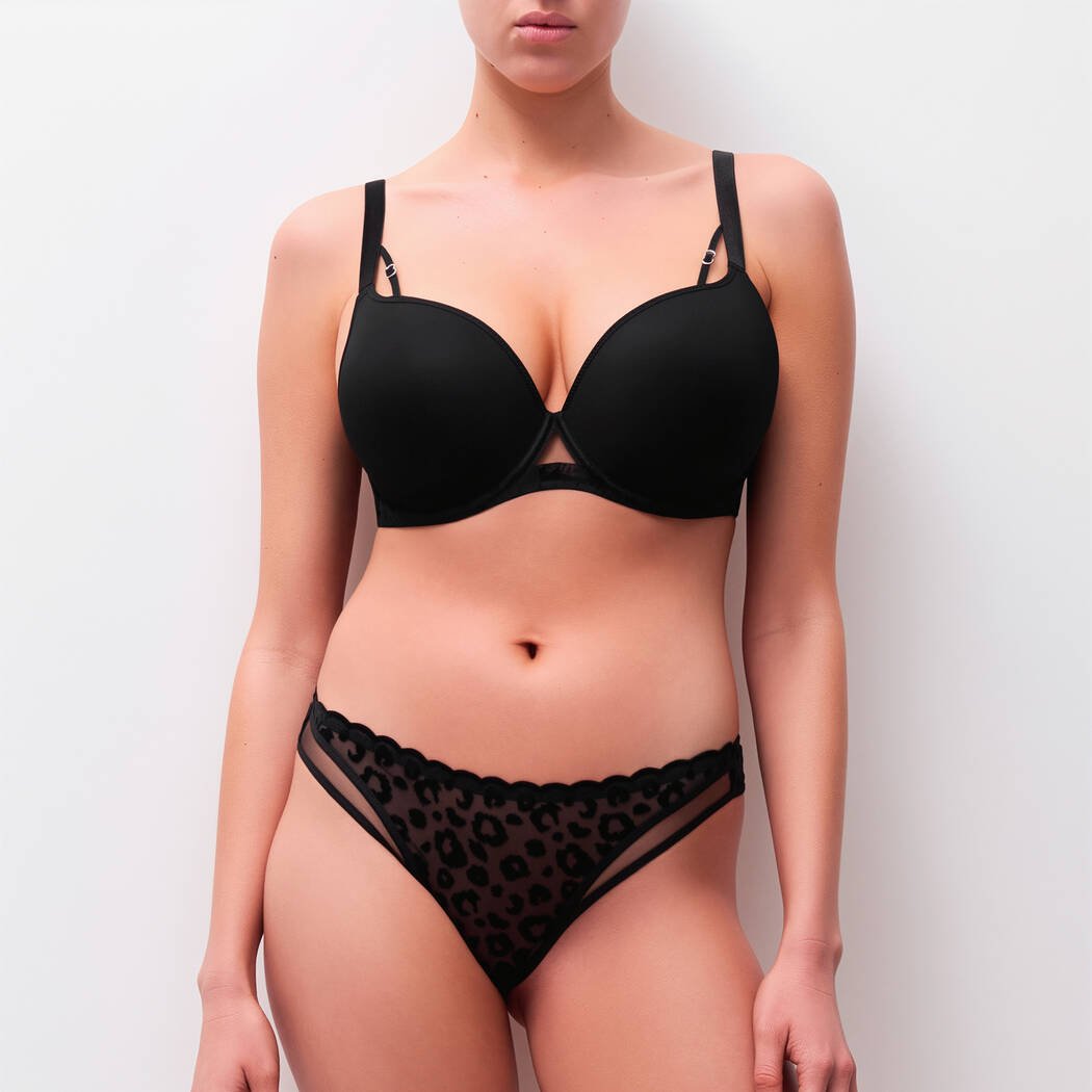 Επενδεδυμένο σουτιέν με μπανέλα. Opaque microfiber αεριζόμενο ύφασμα. Πλαϊνά με ημιδιαφανές τούλι με βελούδινο σχέδιο leopard print. Βελούδινες λωρίδες και κοσμήματα πάνω από τις cups. Με ρυθμιζόμενες τιράντες και κούμπωμα στην πλάτη.